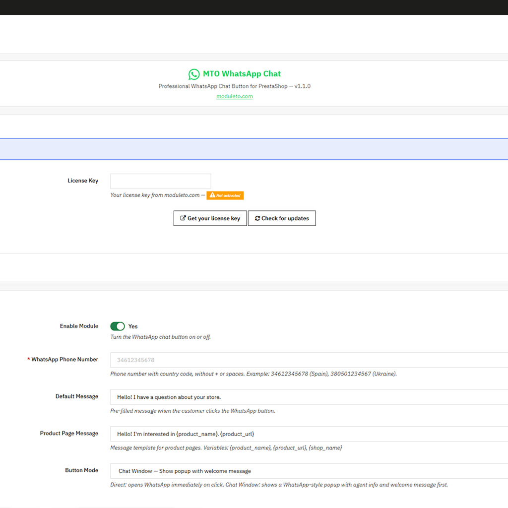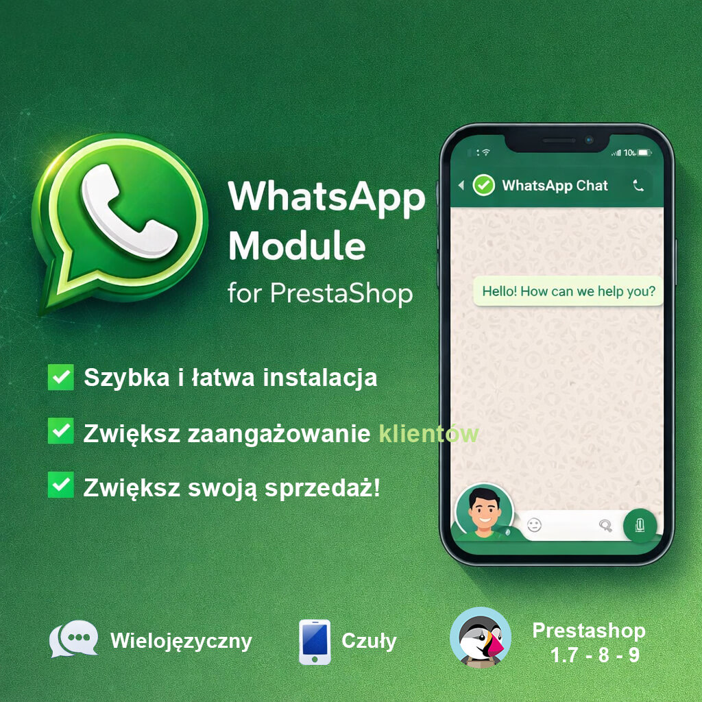 Fügen Sie einen professionellen WhatsApp-Button zu Ihrem PrestaShop-Shop hinzu und ermöglichen Sie Ihren Kunden, Sie mit einem einzigen Klick zu kontaktieren. MTO WhatsApp Chat ist ein leichtgewichtiges WhatsApp-Modul für PrestaShop, das einen schwebenden Button mit einem optionalen Chat-Popup-Fenster anzeigt — originalgetreu zur WhatsApp-Oberfläche.