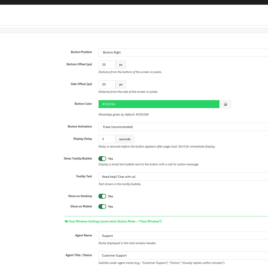 • Button-Farbe — standardmäßig WhatsApp-Grün, oder jede andere Farbe passend zu Ihrer Marke