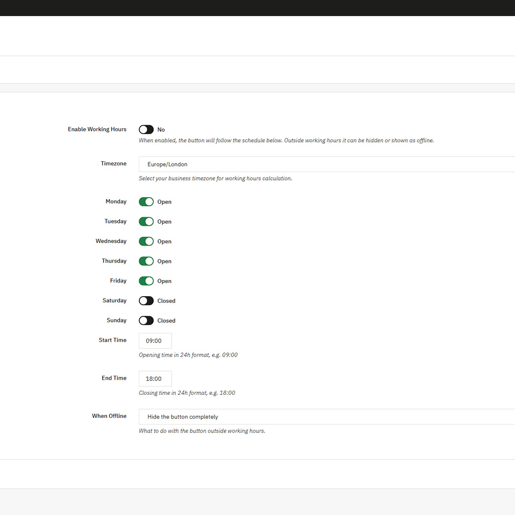 • Automatisches Ausblenden des Buttons außerhalb der Geschäftszeiten, oder