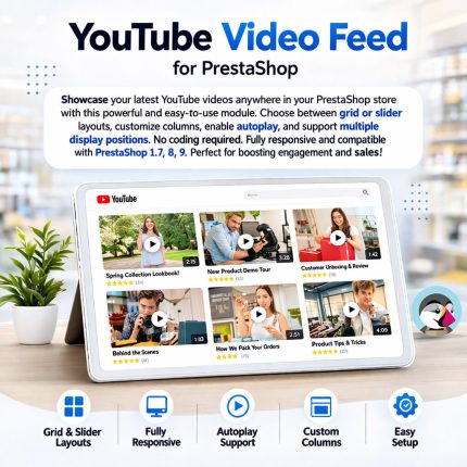 Showcase your latest YouTube videos anywhere in your PrestaShop store with this powerful and easy-to-use module. Choose between grid or slider layouts, customize columns, enable autoplay, and support multiple display positions. No coding required. Fully responsive and compatible with PrestaShop 1.7, 8, 9. Perfect for boosting engagement and sales!