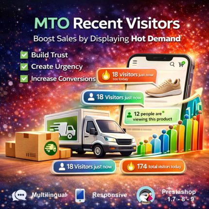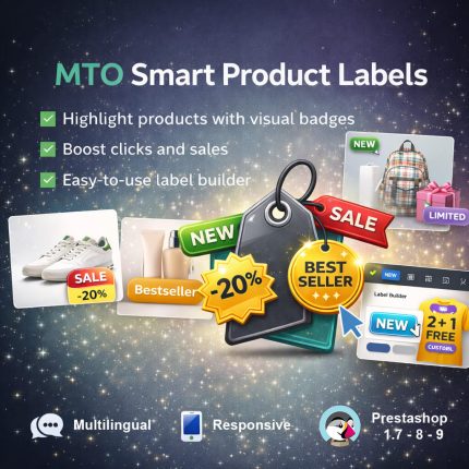 Display eye-catching labels, badges, and stickers on your PrestaShop product images. MTO Smart Product Labels is a powerful PrestaShop product labels module with 10 smart auto-rule types that automatically assign labels like New, Sale, Bestseller, and Low Stock — no manual work required.