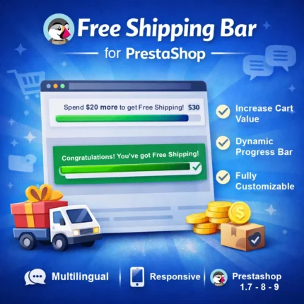 Free Shipping Bar pour PrestaShop augmente le panier moyen en incitant les clients à atteindre le seuil de livraison gratuite. Barre dynamique, design personnalisable, multilingue et responsive.